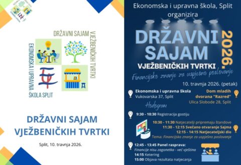 U organizaciji Ekonomske i upravne škole, Split, 10. travnja 2026. u Domu mladeži održan je Državni sajam vježbeničkih tvrtki iz cijele Hrvatske. Cjelodnevno događanje okupilo je učenike iz deset hrvatskih srednjih strukovnih škola ekonomskog usmjerenja koji su pod mentorstvom svojih nastavnika prezentirali tvrtke i proizvode razvijene u sklopu nastavnog predmeta Vježbenička tvrtka i predmeta struke tijekom srednjoškolskog strukovnog obrazovanja.