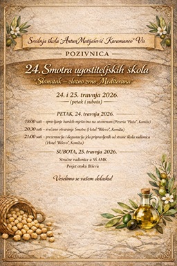Dana 24. travnja, učenici 2. C razreda smjera kuhar Srednje škole Biograd na Moru – Michelangelo Ivano Bosanac i Toni Palaškov, u pratnji nastavnika Marina Banovića, sudjelovali su na 24. smotri ugostiteljskih škola održanoj u Komiži, pod ovogodišnjom temom „Slanutak – zlatno zrno Mediterana“.